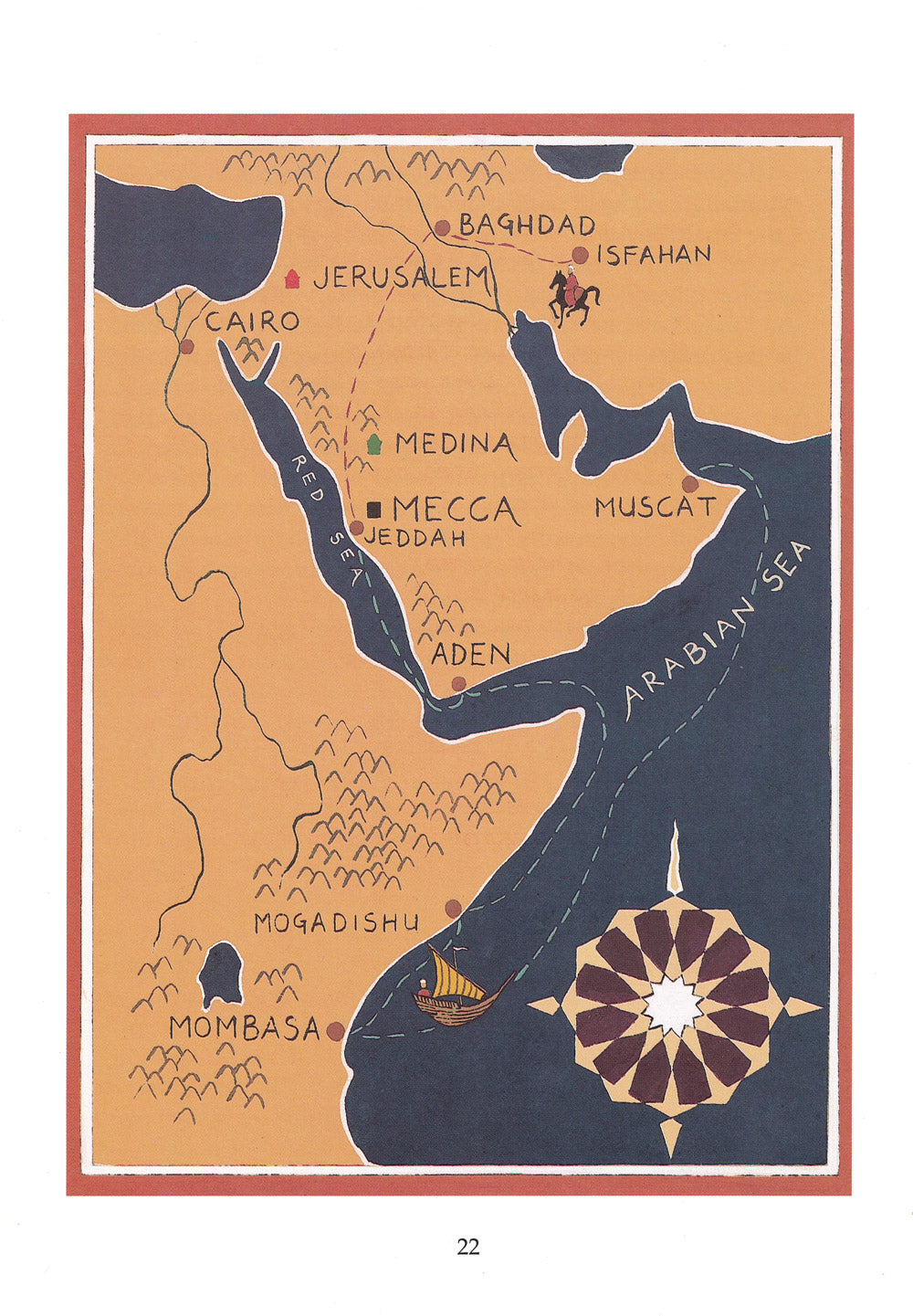 In Ibn Battuta, Son of the Mighty Eagle, the young Moroccan traveller heads for India, but inevitably does not get there! Instead, he comes across a straw hut built for love, has an audience with a poetry-reciting Mongol Emperor, and crosses the shark-infested Red Sea in the company of some camels. In Yemen, his adventures are still not over, as he chews on a leaf which makes him forget his worries, and in Africa, he tastes two exotic and delicious fruits for the first time.