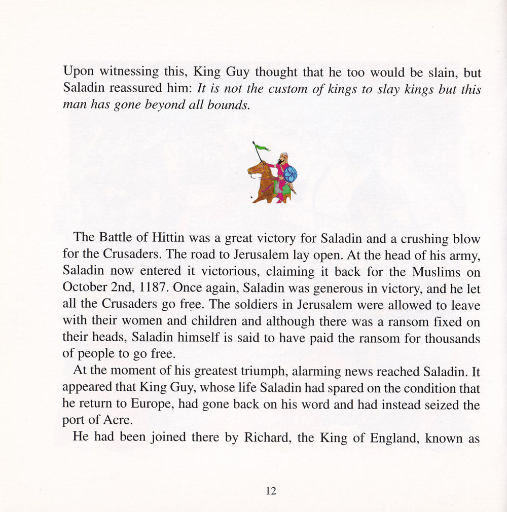 Saladin (Salah al-Din) was one of the greatest and most chivalrous leaders the world has ever known. His desire to regain Jerusalem from the Crusaders who had taken over the city in 1099, drove him to become one of Islam's most formidable military commanders, and culminated in his sweeping victory at the Battle of Hittin. Finally, he could march victorious into Jerusalem! However, it was not long before Saladin's most famous adversary, the King of England - Richard the Lionheart, arrived on the shores of Palestine. Once again, Saladin had to rise to battle.